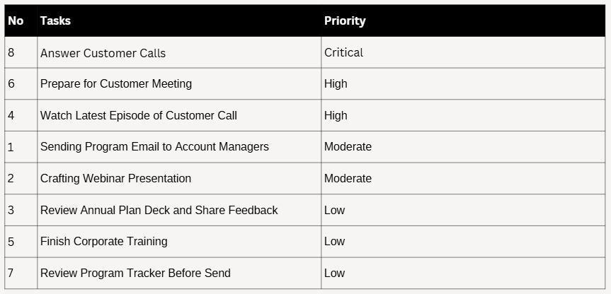 After placing tasks into buckets then you should list these priorities and then find the top %20 to focus on. Your list could look like this: