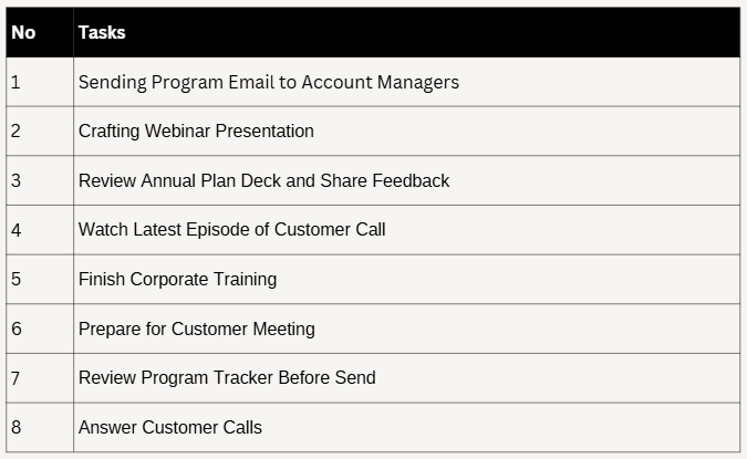 Include all of your tasks without filtering them. These could be urgent, important or could be done later. At this stage applying filters don’t help you but block to complete the list. You can see the example list for your reference as below. Add as many as you wish.